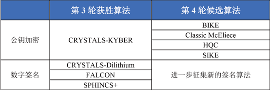 2022年7月,NIST公布[3]了其后量子密码标准化项目第三轮筛选的结果:CRYSTALS-Kyber、CRYSTALS-Dilithium、Falcon、SPHINCS+被选中并成为标准化算法;同时,NIST也提出了四种额外的算法——BIKE、Classic McEliece、HQC、SIKE,将进一步探讨是否将其标准化,希望其中一种或多种算法也可以成为后量子时代合适的替代加密方案。
